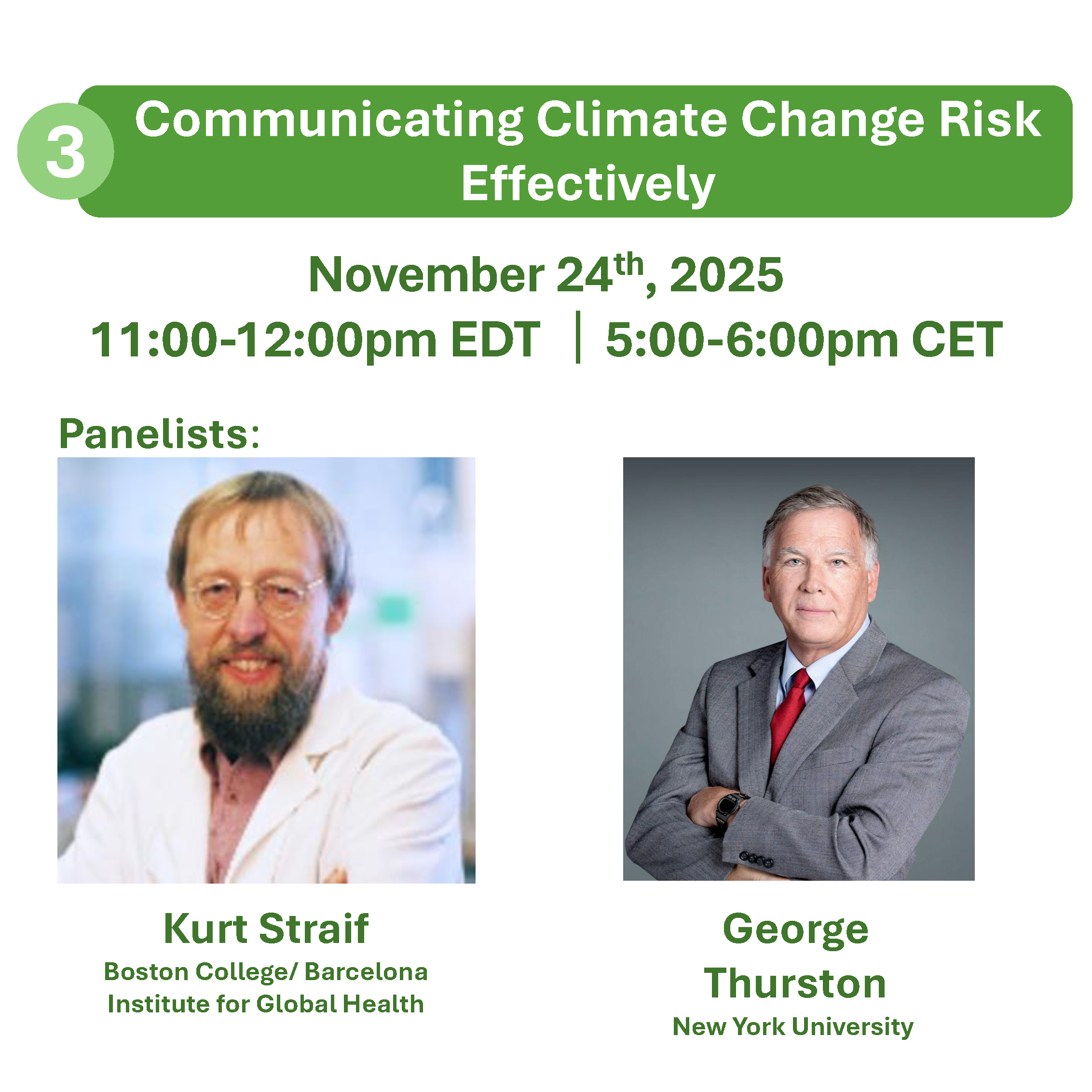 This webinar will explore how evidence-based communication strategies can improve public understanding of climate risks and promote behavioral and policy changes. Speakers will explore how climate advocacy, community engagement, and public health messaging can collaborate to promote climate progress and resilience.